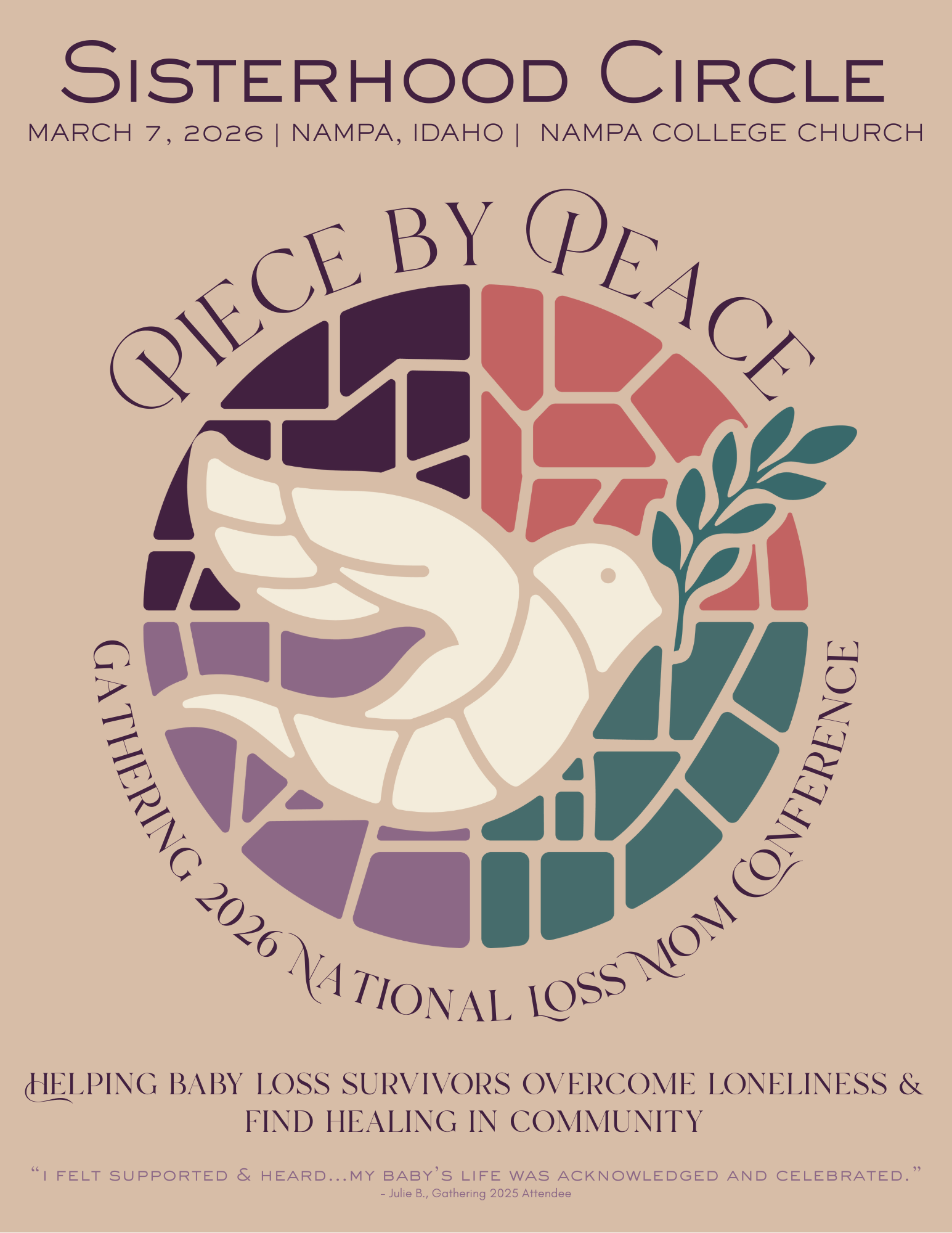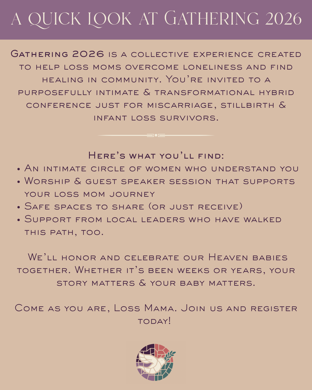 Whether you’ve been grieving for weeks, months or decades, you belong. If you met your baby through a pregnancy test or ultrasound, this conference is for you. If you said hello and goodbye in the same breath, Gathering 2026 is where you’ll find your community. If miscarriage, stillbirth or infant loss is part of your story, this is a space to honor your motherhood, speak your baby’s name, and begin healing, Piece by Peace. You can expect to be welcomed into a place where bonds are formed amongst women who no longer struggle in silence, but are emboldened to speak their babies names.