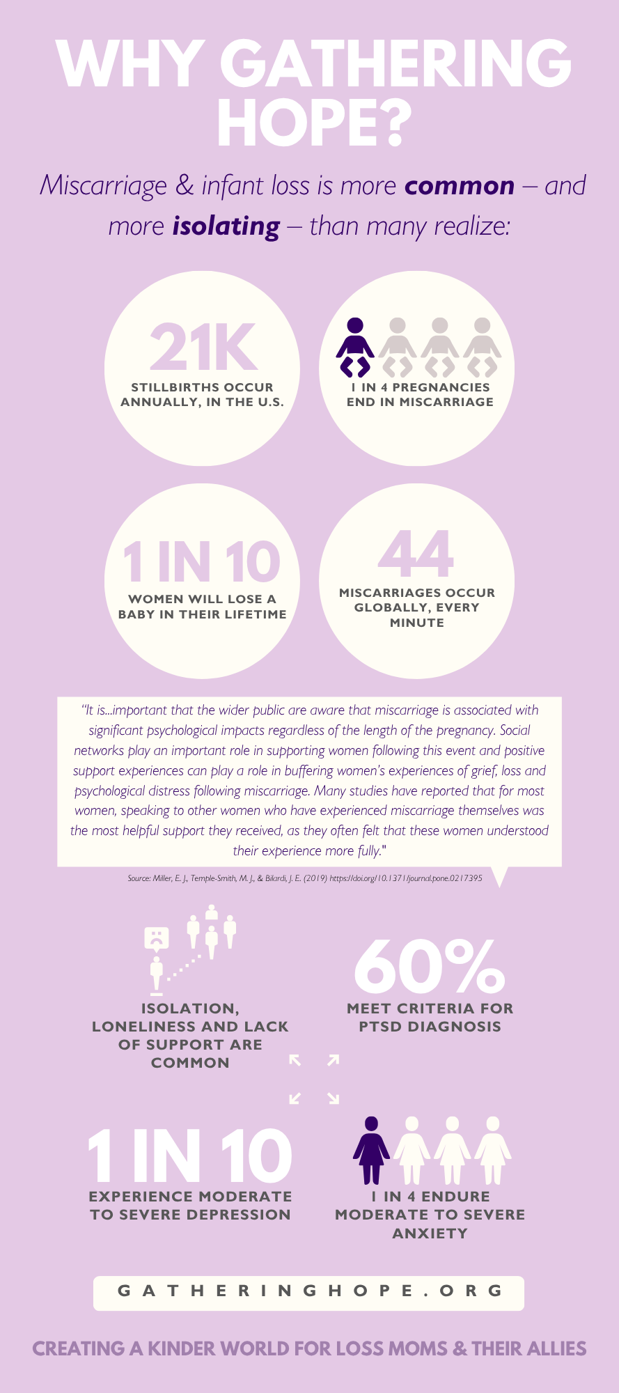 One out of four pregnancies will end in a miscarriage. Each year, approximately 21,000 babies are stillborn in the United States and globally, there are 44 miscarriages every minute. Of those who experience this type of loss, nearly 60% of them experience symptoms of Post Traumatic Stress Disorder (PTSD), 1 in 10 will experience depression and many others will suffer from anxiety related mental health issues. Others endure isolation, loneliness, anxiety, depression, and trauma.