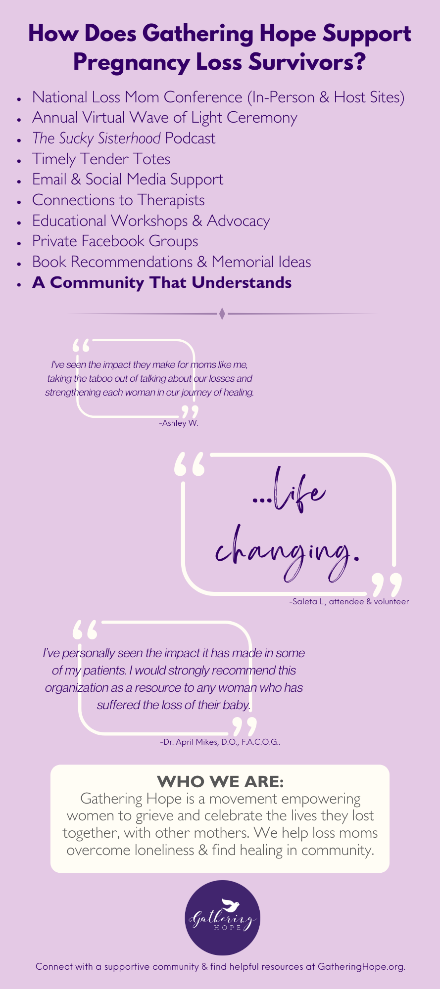 ““Gathering Hope’s yearly events have been such a healing experience for me! I’ve found so much comfort and understanding each time, both through God speaking to my heart during worship, and through the community of women that he has brought together. This is such a needed ministry and I am so thankful to benefit from it has a guest in 2018 and to serve through it by returning as a table leader in 2019. I love being a part of the community we create together! Thank you for committing to provide a safe place for mothers like me.”